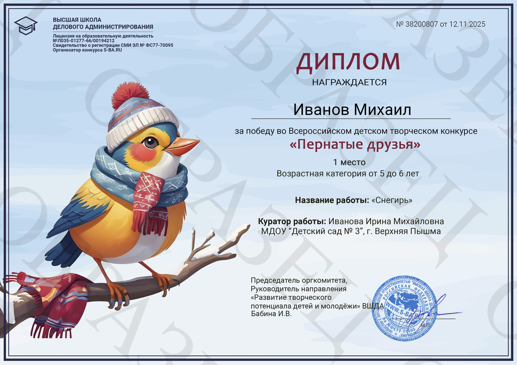 Все детские творческие конкурсы мы проводим БЕСПЛАТНО. Кроме того, на ресурсе s-ba.ru мы размещаем бесплатно электронные наградные документы (дипломы и благодарственные письма). Электронные наградные документы размещаются на сайте в размере (разрешении) 1000х707 пикселов, в формате jpg/jpeg. Бесплатные наградные документы доступны для скачивания в каталоге «Результаты» в течение 2-х месяцев со дня публикации в каталоге.