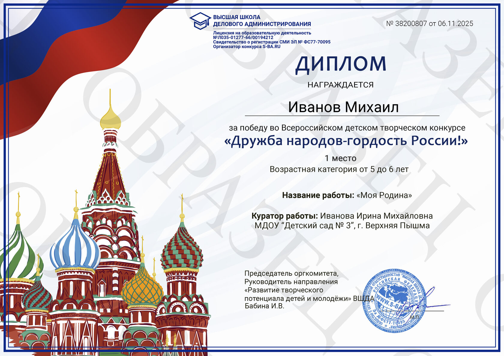 Все детские творческие конкурсы мы проводим БЕСПЛАТНО. Кроме того, на ресурсе s-ba.ru мы размещаем бесплатно электронные наградные документы (дипломы и благодарственные письма). Электронные наградные документы размещаются на сайте в размере (разрешении) 1000х707 пикселов, в формате jpg/jpeg. Бесплатные наградные документы доступны для скачивания в каталоге «Результаты» в течение 2-х месяцев со дня публикации в каталоге.
