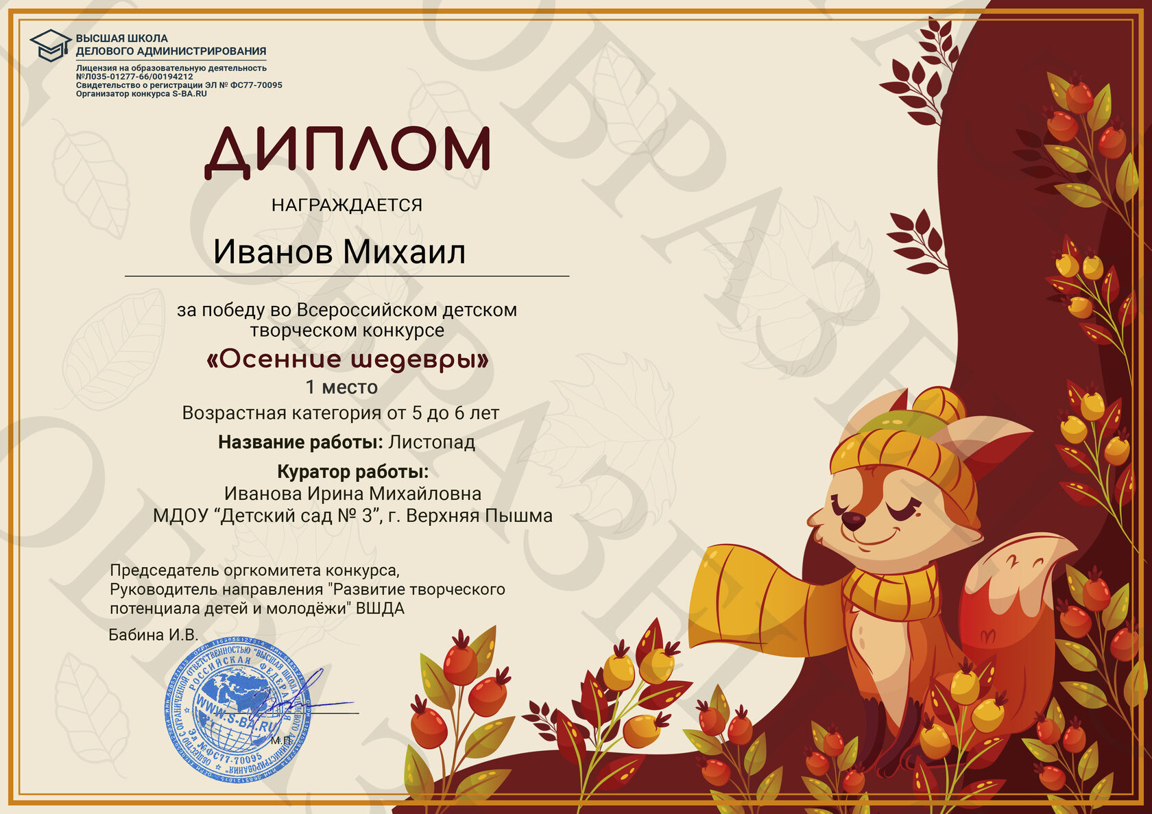 Все детские творческие конкурсы мы проводим БЕСПЛАТНО. Кроме того, на ресурсе s-ba.ru мы размещаем бесплатно электронные наградные документы (дипломы и благодарственные письма). Электронные наградные документы размещаются на сайте в размере (разрешении) 1000х707 пикселов, в формате jpg/jpeg. Бесплатные наградные документы доступны для скачивания в каталоге «Результаты» в течение 2-х месяцев со дня публикации в каталоге.