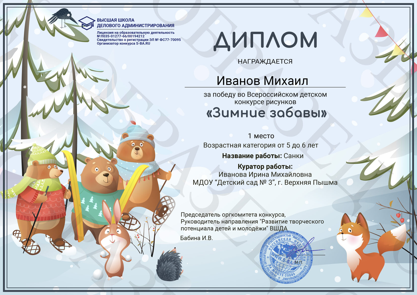Все детские творческие конкурсы мы проводим БЕСПЛАТНО. Кроме того, на ресурсе s-ba.ru мы размещаем бесплатно электронные наградные документы (дипломы и благодарственные письма). Электронные наградные документы размещаются на сайте в размере (разрешении) 1000х707 пикселов, в формате jpg/jpeg. Бесплатные наградные документы доступны для скачивания в каталоге «Результаты» в течение 2-х месяцев со дня публикации в каталоге.