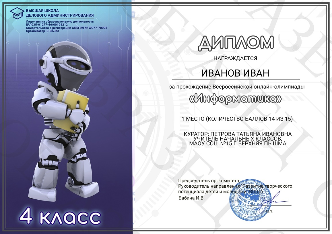 ✔ По желанию вы можете заказать комплект наградных документов (диплом и благодарственное письмо - 40 руб), который(-е) сразу же будет направлен на вашу электронную почту или их можно будет скачать с сайта.